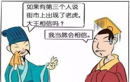 这个说的是魏国的大臣庞葱和魏国的太子一起到邯郸做人质的故事。庞葱对魏王说:“大街上确实没有老虎,但是说的人多了,大家也就信了。邯郸离魏国遥远,污蔑我的人何止是三个。”告诫魏王不要轻信他人诬告之词。结果当关于他的诬告之词传到魏王那里,最后魏王还是远离了庞葱。