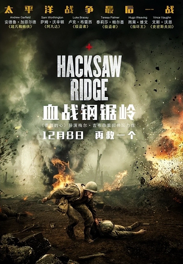 《血战钢锯岭》是熙颐影业、麒麟影业出品的战争历史片,由梅尔·吉布森执导,安德鲁·加菲尔德、萨姆·沃辛顿、卢克·布雷西、泰莉莎·帕尔墨、雨果·维文、瑞切尔·格里菲斯、文斯·沃恩主演。该片改编自二战上等兵军医戴斯蒙德·道斯的真实经历,讲述他拒绝携带武器上战场,并在冲绳战役中赤手空拳救下75位战友的传奇故事。该片于2016年11月04日在美国上映、12月08日在中国上映。