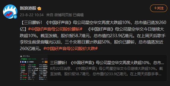 所以当《中国好声音》陷入风波后,星空华文的崩塌是如此迅速。8月18日,星空华文创上市以来单日最大跌幅,公司市值在一天之内蒸发超100亿港元。