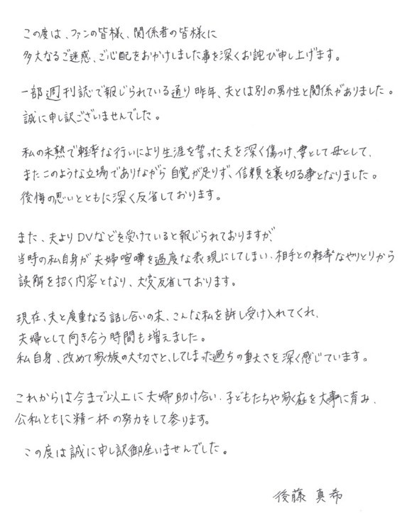 后藤真希坦承如同週刊报导,「我去年(2018)和别的男人发生关係,真的很抱歉。我轻率不成熟的行为,深深伤害了誓言相守一生的丈夫,身为妻子、身为母亲,还没有做好这个角色的自觉,做出了背叛信任的事,现在除了很后悔,也深深地反省中。」