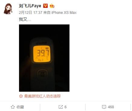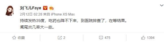 昨天晚上,刘飞儿发微博表示自己在发烧,达到了39度,在医院排查,不过是阑尾炎的几率比较大。