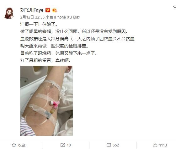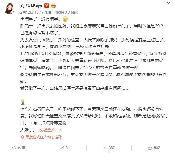 然后过了大概10个小时后,刘飞儿更新微博表示结果上有没说出结果来,并描述了自己高烧去医院检查的一个过程,她表示当时大晚上11点的时候自己发烧39.3度,一度烧到神志不清,腹痛到无法直立行走,因为怕连累家里人自己去了医院检查,检查大概率排除了肺炎,CT也没有大问题,就是血液数据不对,感染科医生表示像阑尾炎,但是外科医生看不出来哪里的炎症,做腹部CT也没有能看出结果。