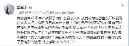而盛蕙子就是勇敢站出来正面刚的其中一位室友,称大家都是在恶意揣测她们的用意,自己不过是十八岁的女孩子,只是想要安安静静的过自己这个年纪该有的花季,还说自己不是大家看关晓彤的途径。