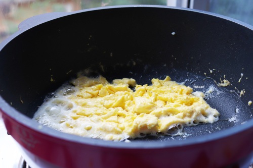 3.滑蛋时火力不宜过猛,否则底部会变成焦脆,待蛋液还未完全凝固时