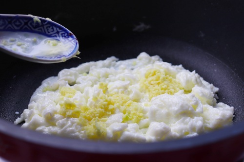 5.紧接着往锅中加1勺油,放入蛋黄,同样开小火,用筷子来回滑动将蛋黄铲出碎块状,倒入剩下的姜醋汁混合均匀,把炒好的蛋黄盖在蛋白上就做好啦