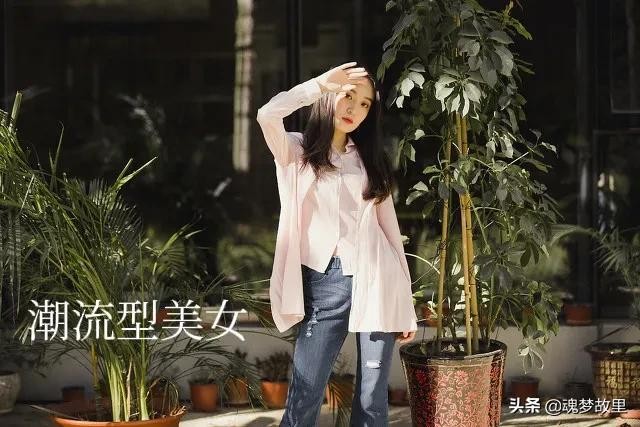 潮流型美女,一手遮阳,站立花旁,非常自然,搭衣合适,更感潮流。