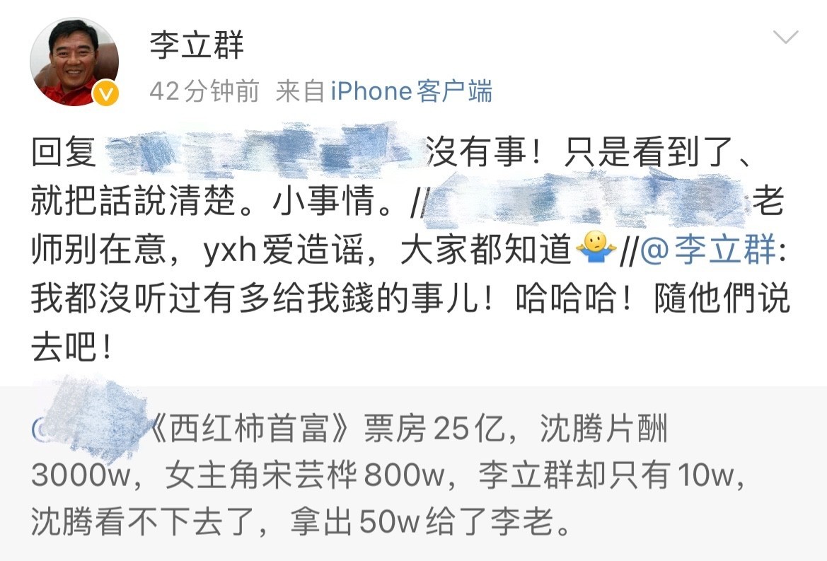 李立群老师在这个内容上转发评论表示:“我都没听过有多给我钱的事!哈哈哈!随他们说去吧!”,随后有网友评论李立群老师,让他别在意,yxh爱造谣大家都知道。