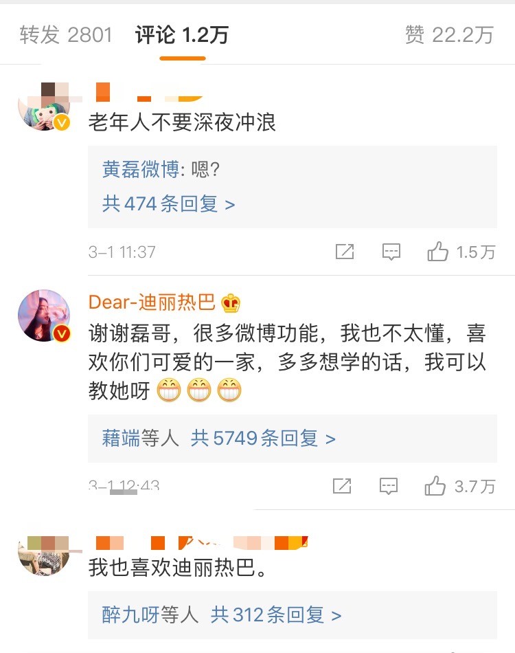 黄磊发了这条微博后,迪丽热巴本人很快就赶来评论:“谢谢磊哥,很多微博功能,我也不太懂,喜欢你们可爱的一家,多多想学的话,我可以教她呀。”