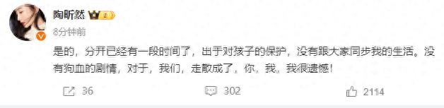 3月25日,演员陶昕然发文宣布离婚:是的,分开已经有一段时间了,出于对孩子的保护,没有跟大家同步我的生活。没有狗血的剧情,对于,我们,走散成了,你,我,我很遗憾!