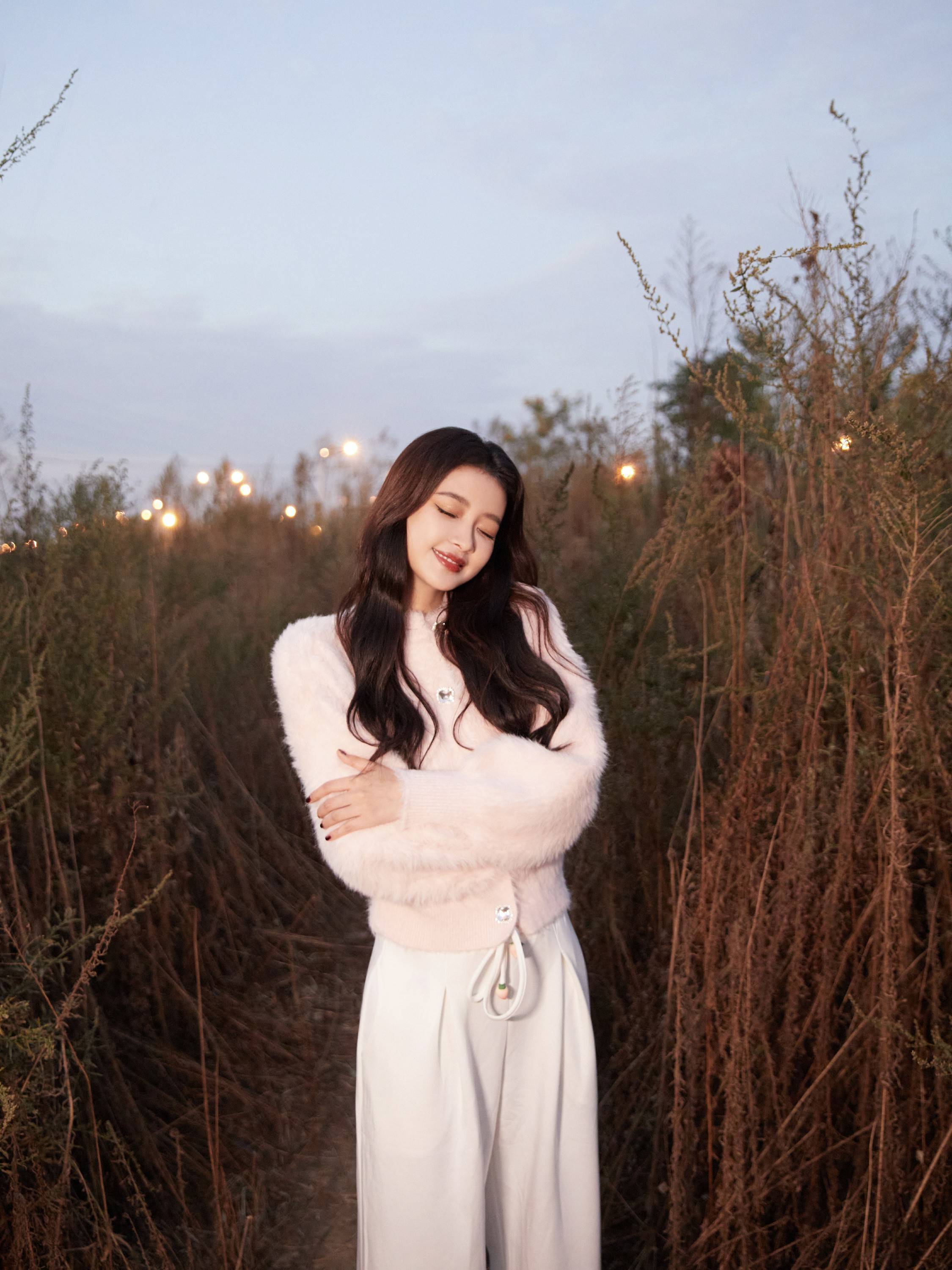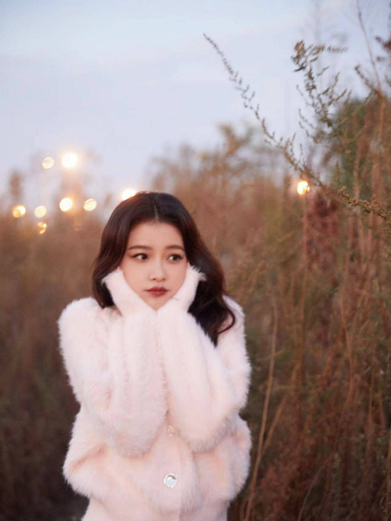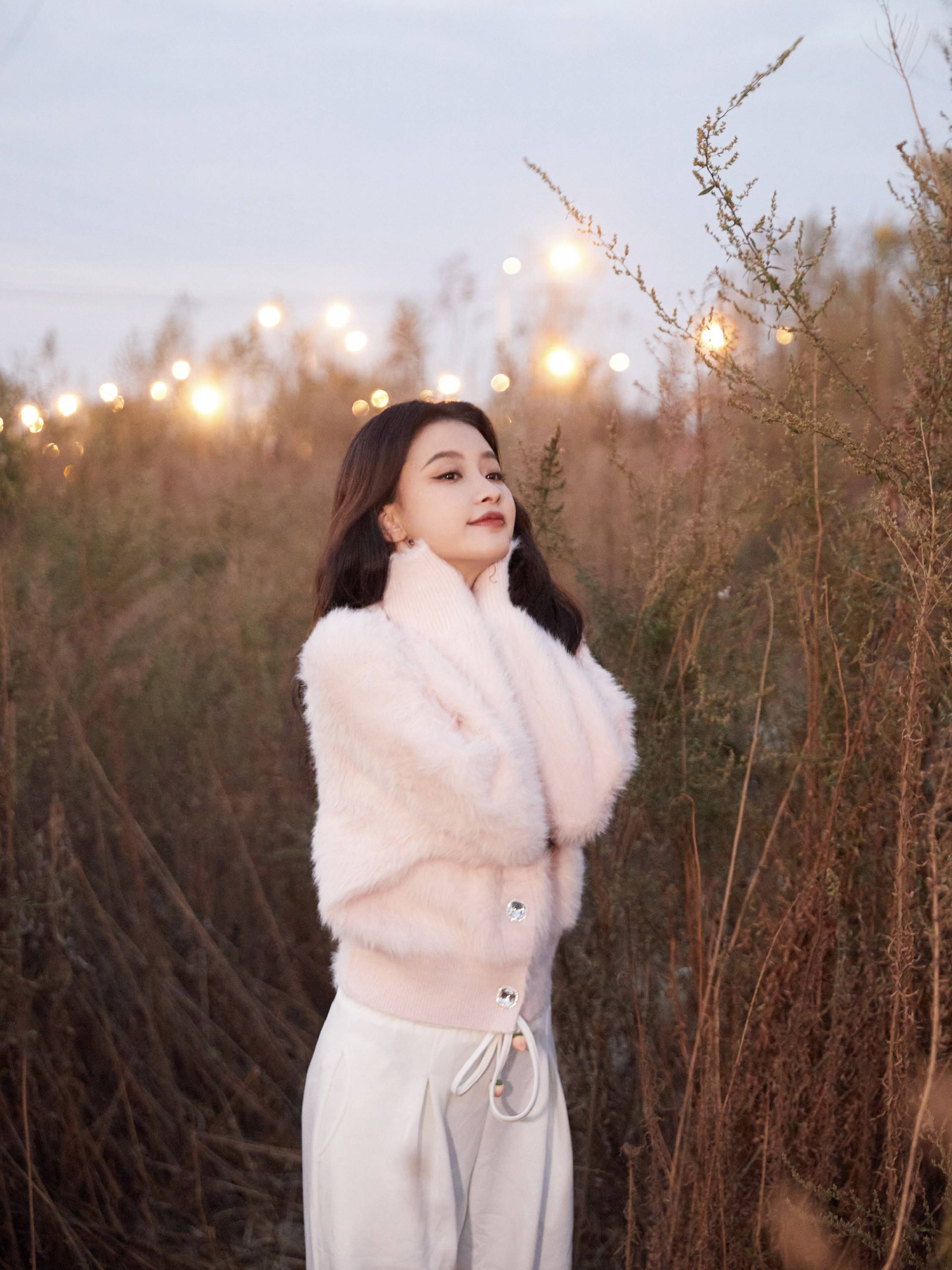 以一件淡粉色毛绒外衣搭配微卷长发,“孙氏穿搭”简单又耐看,造型上有很多可以参考的点,比如素色穿搭跟栗色口红的搭配,有种晚秋的美感。深秋总是自带凉意和让人放松的惬意感,在接近黄昏时刻,草丛是很好的拍照地点,孙怡这组在草丛里举着手向天空“比耶”的照片,轻闭双眼看上去放松又很舒适,加上甜甜的笑容太美好了。