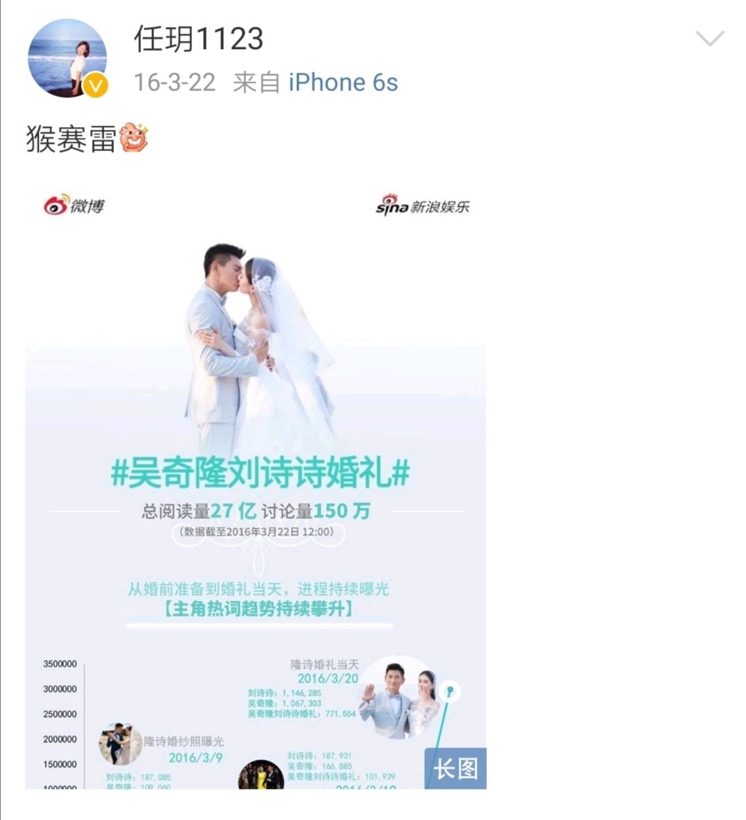 吴奇隆和刘诗诗结婚当日,任玥关注的是婚礼话题的数据。