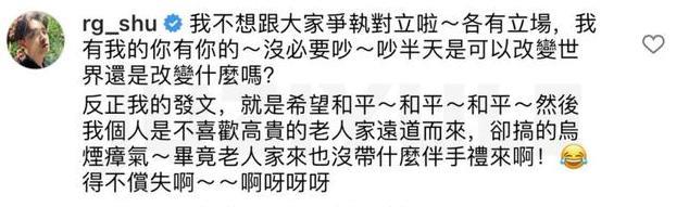 也有不少网友在陈德修的评论区发了一些不和谐的言论,看到这些负能量,陈德修也很真诚的解释到,他的所有发文只是希望“和平”,不想因为"老人家”的到来而搞得乌烟瘴气。