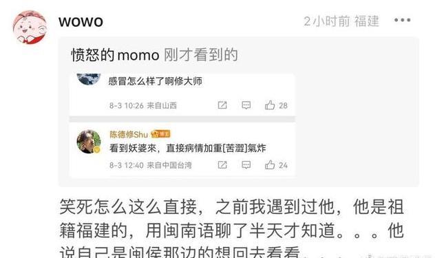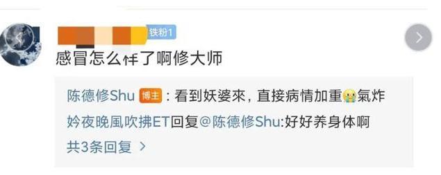 陈德修这一举动让不少网友感动,纷纷都在关心他感冒好了没有?他则带着幽默回应:“妖婆”的到来气得“病情加重”。