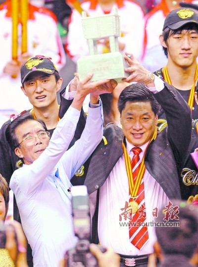 2010年4月25日,陈林与广东东莞银行队主教练李春江共同捧起CBA总冠军奖杯。 新华社记者 刘大伟 摄