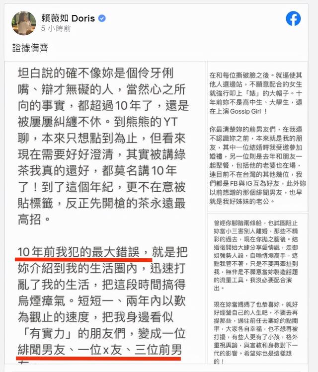 在赖薇如的发文中满满都是愤怒,她直言非常后悔在十年前认识王思佳。原本只想点到为止,不想把话说得太清楚,但是却被王思佳的挑衅屡屡纠缠,所以如今必须要好好地澄清了。