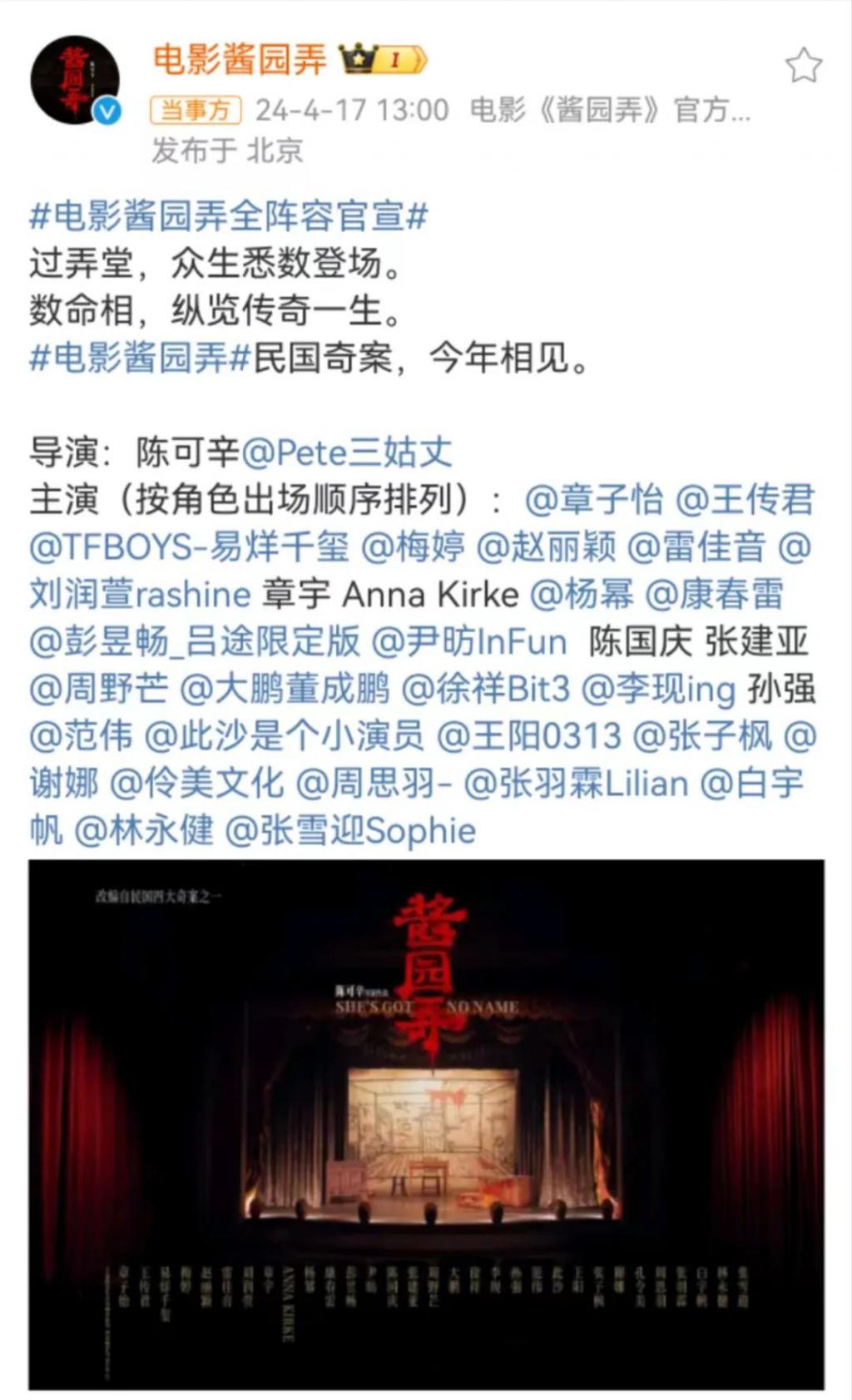 电影开机后,在主演章子怡和各路明星配角的加持下,酱园弄的营销更是加大力度、愈演愈烈。