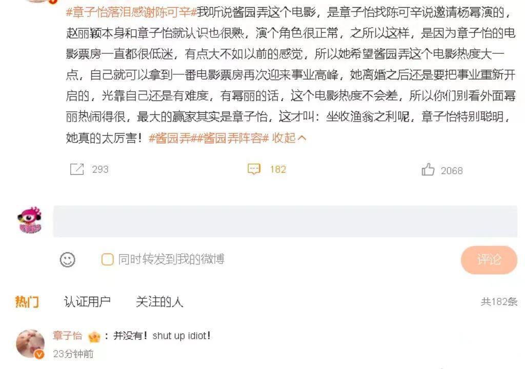 后是亲自下场怒怼网友,在内涵她为了票房撺掇导演请流量大花的微博下大秀英文,回道 " 并没有!shut up idiot!"