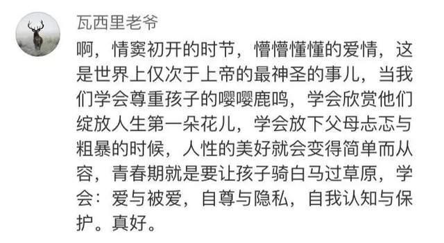 在懵懂的青春期,孩子之间那种单纯的情愫,越是压制或许越容易适得其反,她认为,谈早恋可以,但不能把自己轻易给别人。